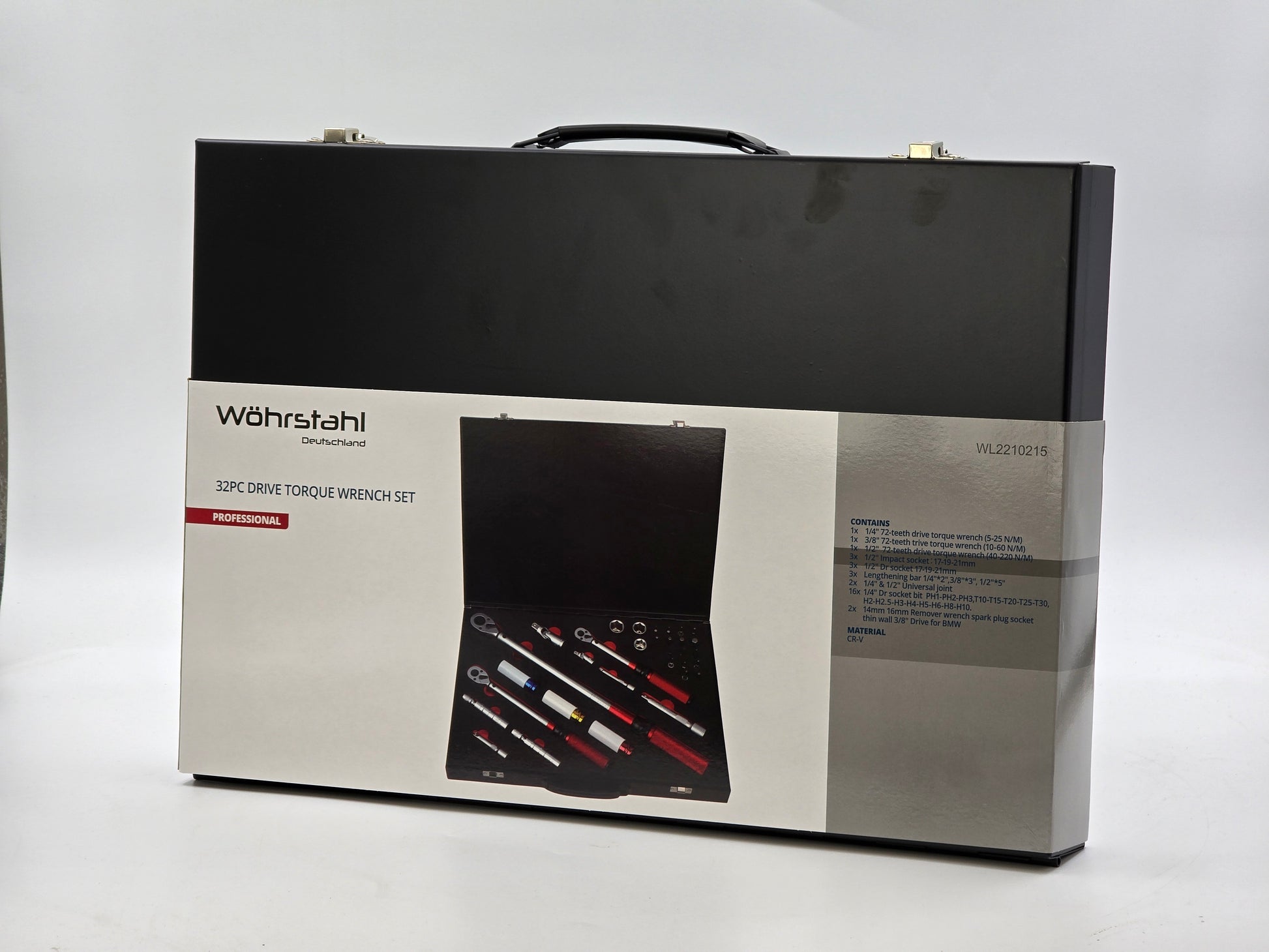 The Wöhrstahl 32-piece Drive Torque Wrench Set is a professional-grade kit designed for precision tightening and controlled torque applications. This comprehensive set includes multiple torque wrenches, bits, and sockets, making it ideal for automotive and workshop use.